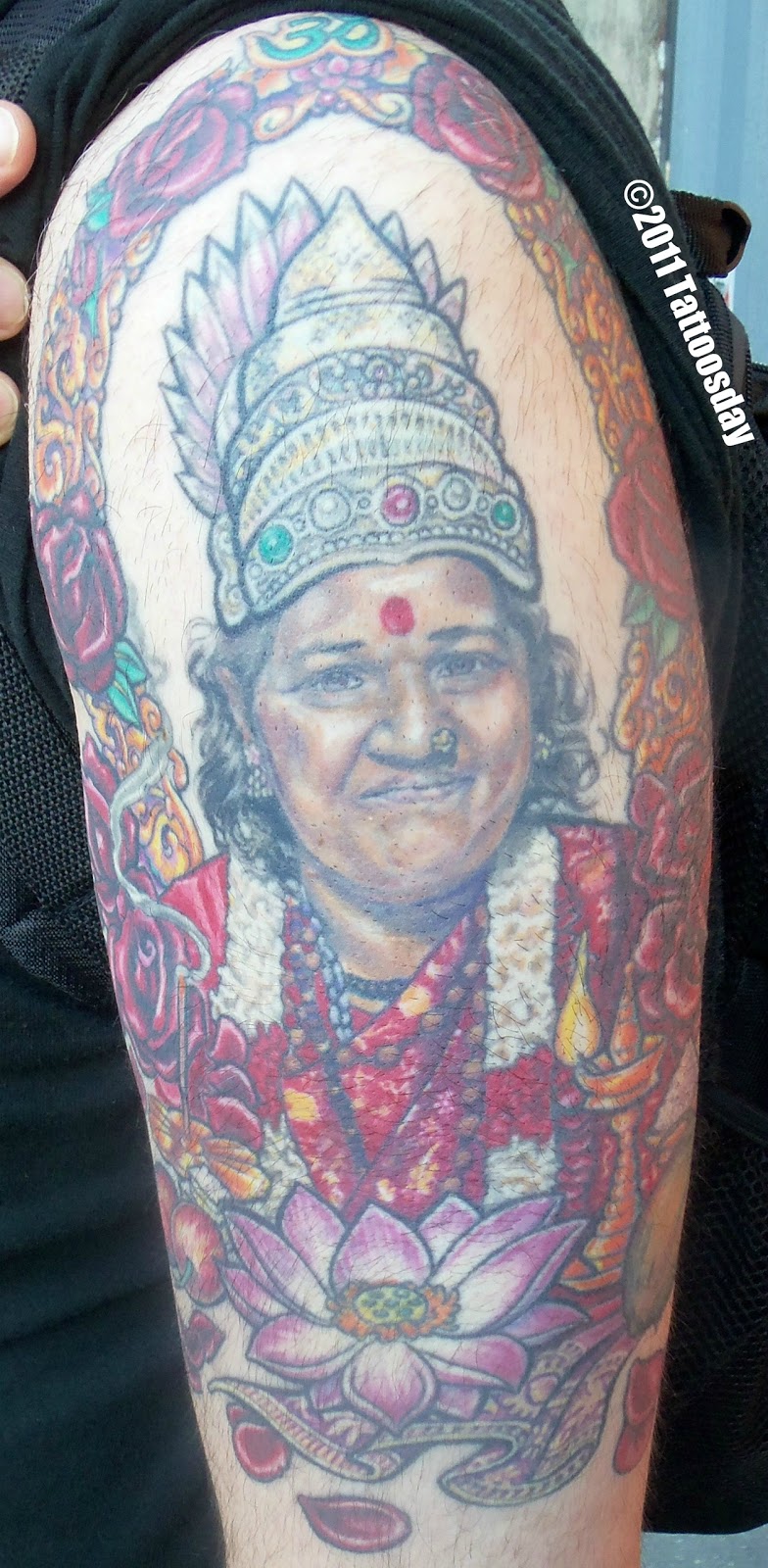 "This is Amma, who is the Divine Mother and comes from India ... she's a great humanitarian leader and spiritual leader. She does a lot of good work. The 'Hugging Saint' they call her in the West...Denise [de la Cerda] is amazing, one of the things is that it's really difficult to capture ...it's considered a great blessing if you can have Amma's image like this ... Denise is very blessed because this is so real life that it's kind of unbelievable....Take a look, also, at the amazing detail Denise created in the flower garland around Amma's neck. This truly is a sensational piece of tattoo art.